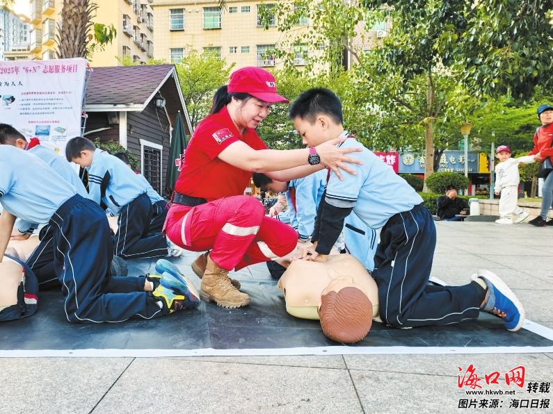海口民間災害應急救援隊志愿者帶領青少年學習急救技能。