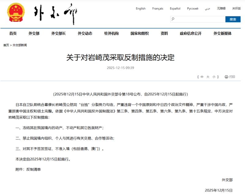 日本自衛隊前統合幕僚長巖崎茂公然同“臺獨”分裂勢力勾連,嚴重違背一個中國原則和中日四個政治文件精神,嚴重干涉中國內政,嚴重損害中國主權和領土完整。依據《中華人民共和國反外國制裁法》第三條、第四條、第五條、第六條、第九條、第十五條規定,中方決定對巖崎茂采取以下反制措施: